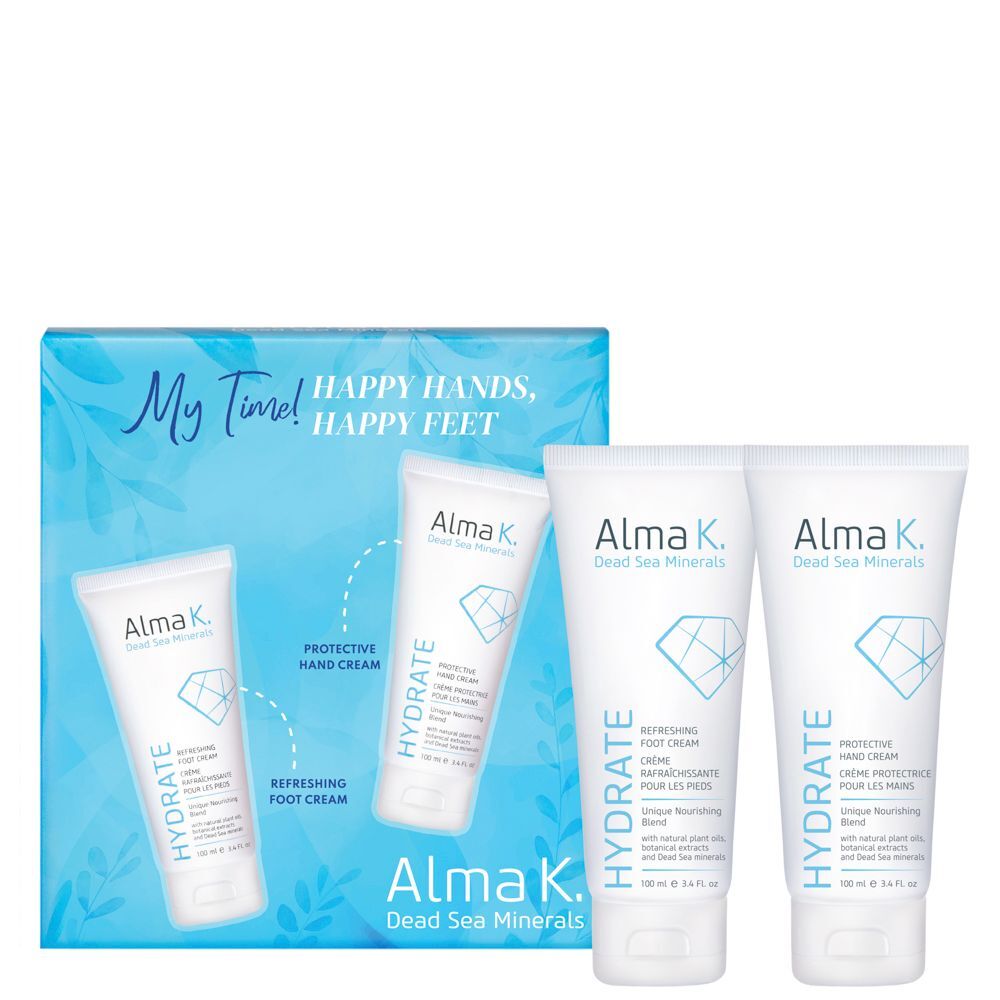 Alma K. Happy Hands Happy Feet е луксозен комплект за грижа за ръцете и краката, създаден да осигури интензивна хидратация и подхранване. С обогатени формули, включващи минерали от Мъртво море, масло от ший и натурални растителни екстракти, тези продукти осигуряват дълбока влага и възстановяване за суха и напукана кожа. Кремът за ръце оставя кожата мека и гладка, докато кремът за крака облекчава умората и освежава стъпалата. Идеални за ежедневна употреба, продуктите от Alma K. Happy Hands Happy Feet ще ви дарят с чувство на комфорт и грижа, като оставят кожата ви здрава, подхранена и копринено мека. Насладете се на цялостна грижа и поглезете ръцете и краката си с този изключителен комплект.