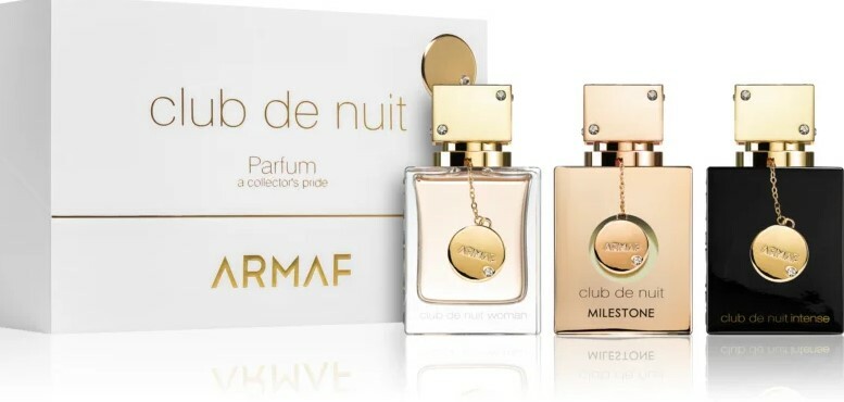 Комплекта съдържа: парфюмна вода Club de Nuit Woman 30 ml + парфюмна вода Club de Nuit Milestone 30 ml + парфюмна вода Club de Nuit Intense Woman 30 ml